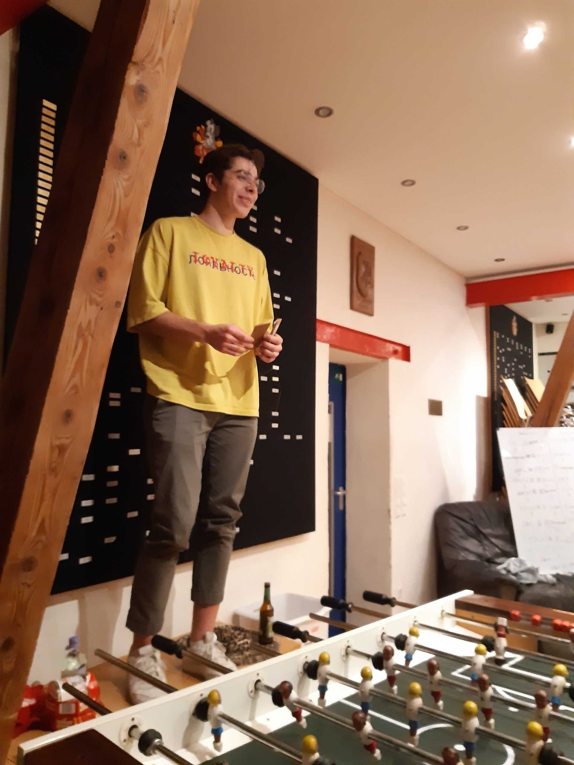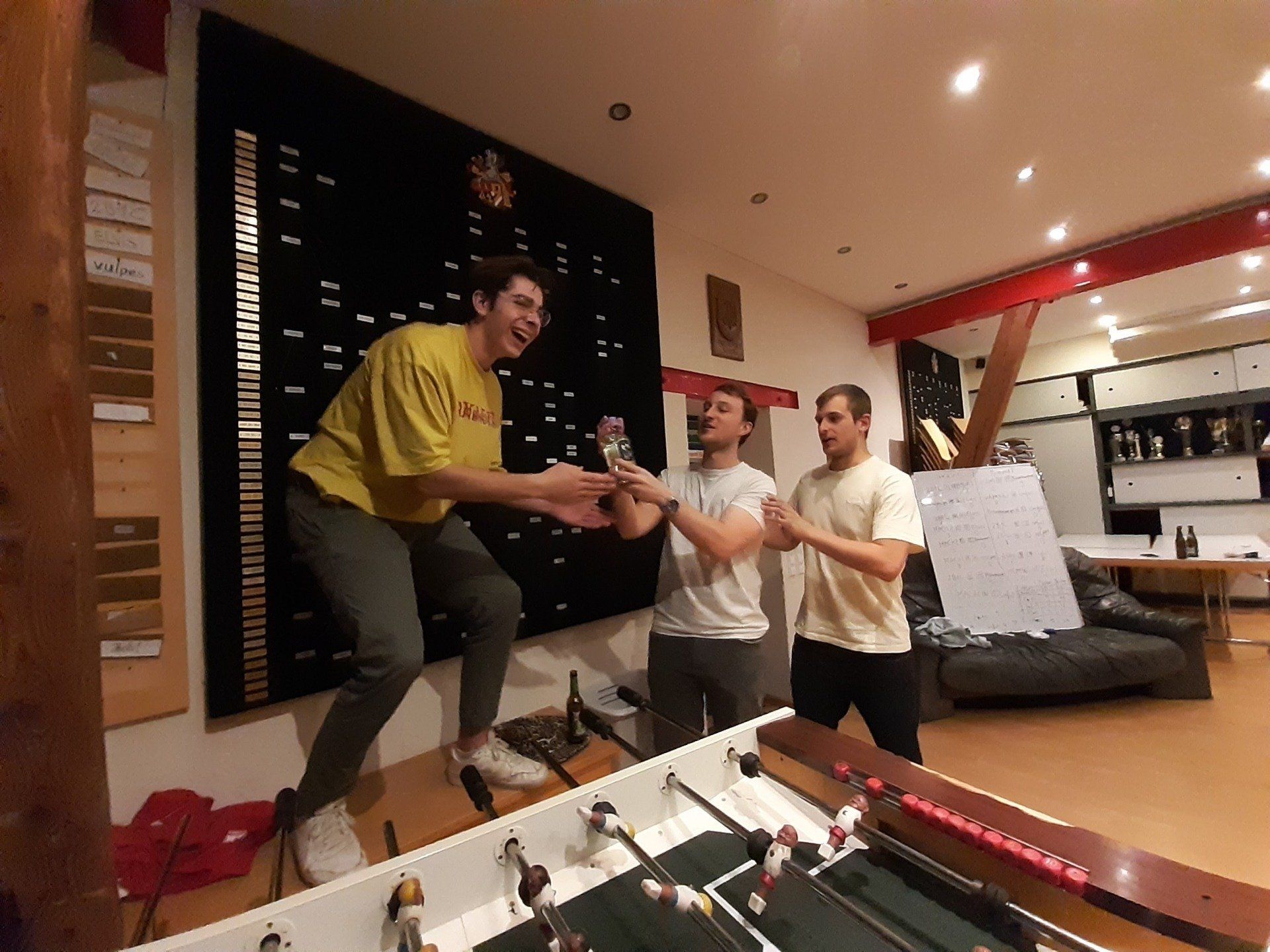 Bericht zum Nebenbaucup im Wintersemester 24/25 Wie gewohnt trafen wir uns um 19 Uhr im Nebenbau, um wie jedes Semester den Nebenbaucup auszutragen. Zum Aufwärmen starteten wir mit einer Runde Flunkyball, bevor es in den eigentlichen Wettkampf ging. Dieses Mal allerdings mit einer Neuerung bei der Teamgestaltung. Anstatt in Zweierteams gegeneinander anzutreten, wurde etagenintern gespielt. Auch bei der Disziplinauswahl gab es einige Neuerungen. Wie gewohnt sorgte beim Tischtennis ein Netz aus Rothaus-Flaschen für eine große Herausforderung. Bierpong durfte natürlich nicht fehlen und sorgte für einige knappe Duelle. Beim Pantomime-Spiel wurden kreative Darstellungen und wilde Interpretationen gefordert. Beim Gurgeln der Songs traten bei der ein oder anderen Person gewisse Koordinationsschwierigkeiten auf, sodass der ein oder andere Schluck Wasser auf dem Boden landete. Auch beim Dart ging es hoch her, wobei nicht nur ein Pfeil die Scheibe nicht fand, sondern in der Wand landete. Ein Highlight war Titticup, bei dem jeweils zwei Spieler diagonal gegenüberstanden. Ziel war es, den Tischtennisball nach einem einmaligen Aufkommen auf dem Tisch mit der Brust in einen Bierpongbecher des Teampartners zu befördern. Wenn dies gelang, musste das gegnerische Team, welches am selben Tisch spielte, den getroffenen Becher austrinken und solange pausieren. Trotz zahlenmäßiger Überlegenheit konnte sich die dritte Etage nur den vierten Platz sichern. Die nullte Etage schaffte es gerade so aufs Treppchen, während die erste Etage den zweiten Platz belegte. Der verdiente Sieger des Abends war die zweite Etage, die mit konstant starken Leistungen überzeugte. Alles in allem war es ein großartiger Abend voller Spaß, spannender Duelle und dem ein oder anderen Bier. Wir freuen uns schon auf den nächsten Nebenbaucup!